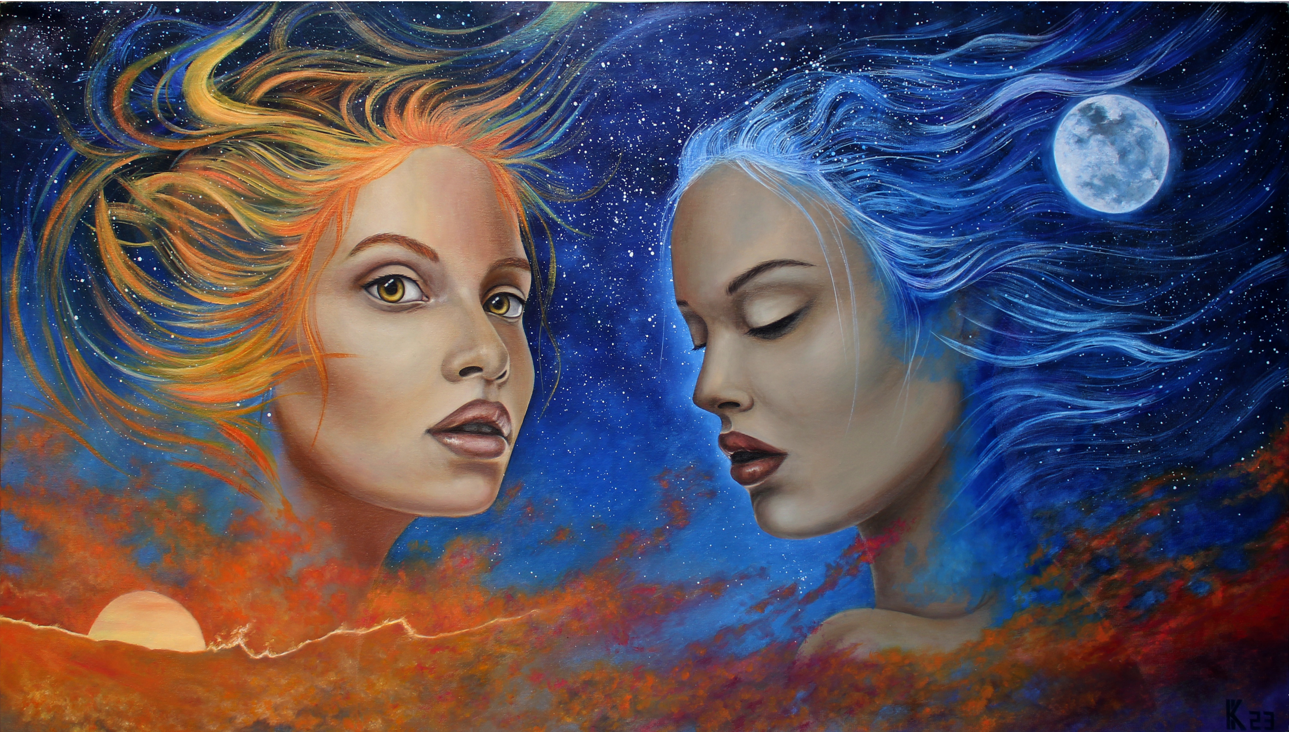 The painting "Day and Night" unfolds a captivating scene embodying two opposing states - the vibrant energy of the sun and the tranquil mystery of the night. On the right side stands a girl personifying the sun, with her fiery red hair resembling bursts of flame, reminiscent of the sun's radiance. Her open eyes reflect a sense of alertness and awakening. Dawn gracefully transitions into the dark starry night from her side of the canvas.