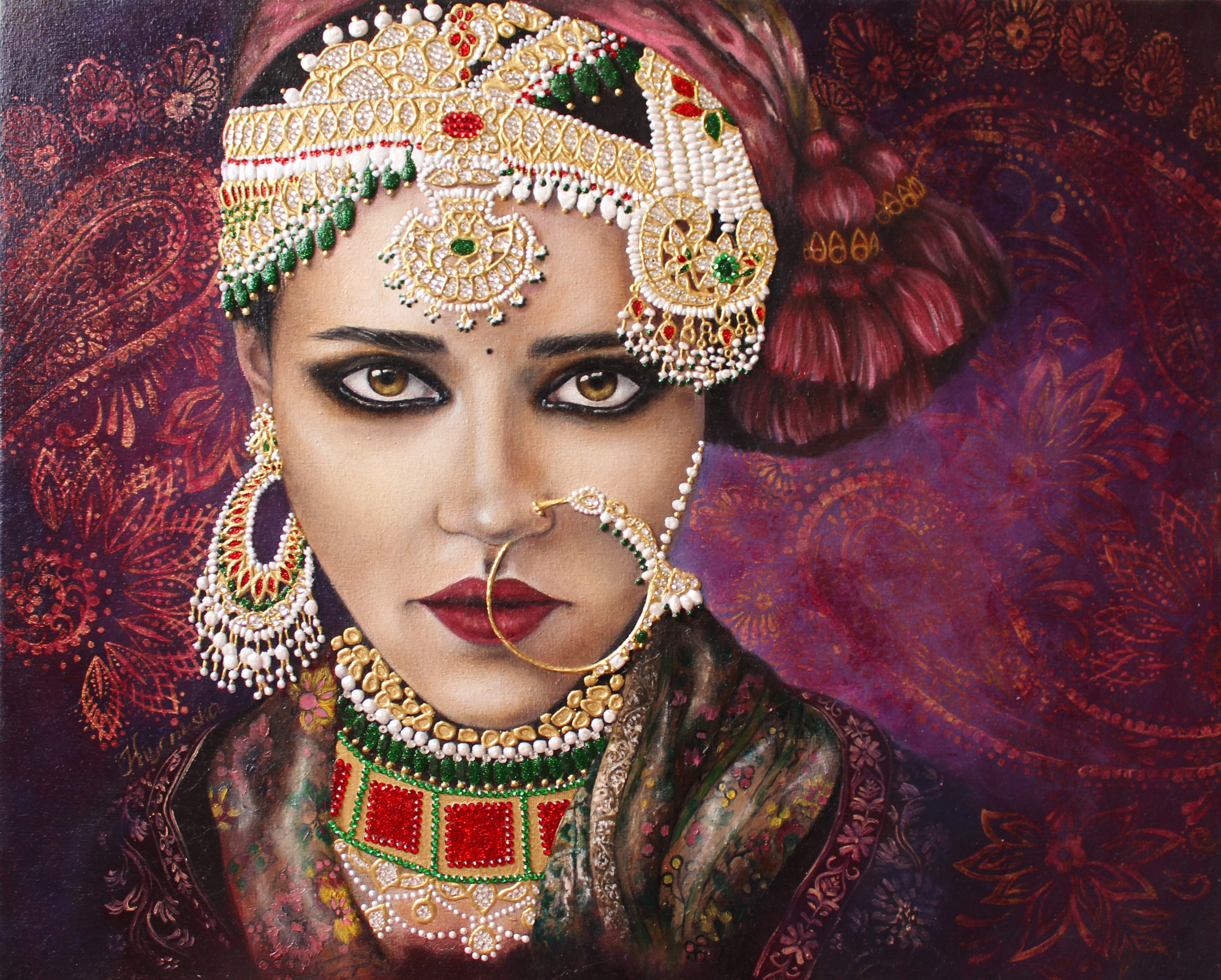 An incredible picture unfolds before you, a girl dressed in an elegant and traditional Indian outfit, fascinates with her look. This look has something deep and unusual in it, which is directed straight into the eyes. This picture transports us to a unique calm world contemplation and enriches our understanding of the beauty and mystery of another world.