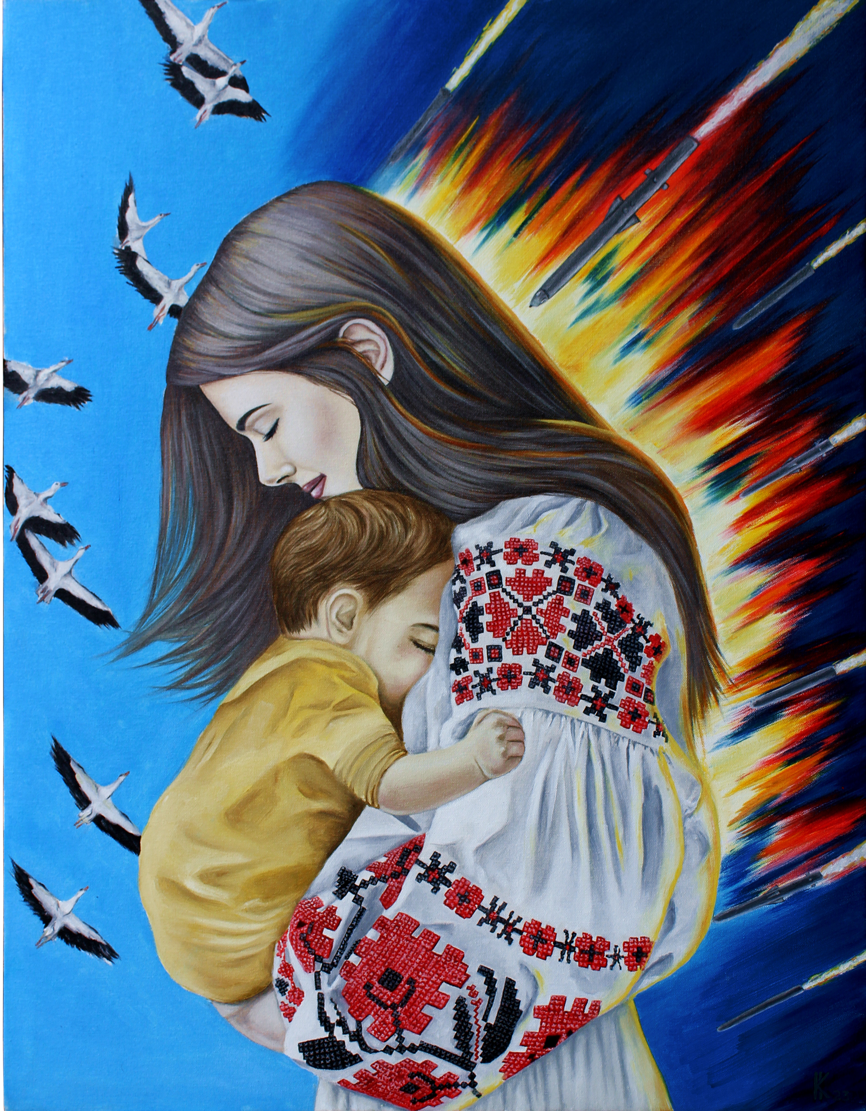 On the other hand, the infant in her embrace becomes a paradoxical arc of hope and future. The clear sky across which storks gracefully glide brings a touch of positivity, peaceful life, and possibility. The storks, bearing the significance of Ukraine's national bird, embody more than a cultural connection—they carry news of good tidings, transcending the fear and weariness of war.
