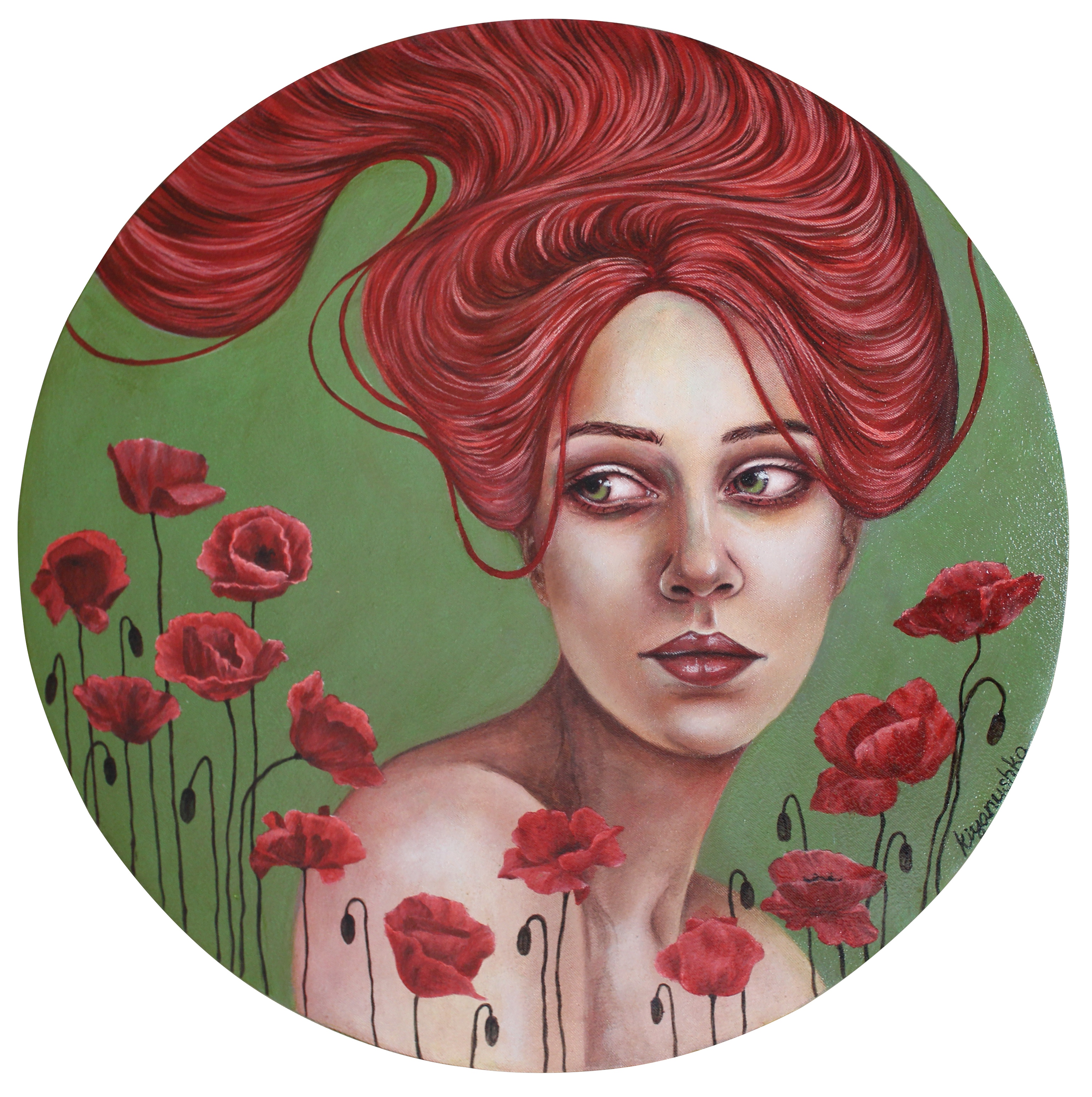 Before you lies a canvas titled «Mavka,» a self-portrait in the guise of a «mavka.» In Slavic mythology, the «mavka» is a woodland nymph akin to a mermaid , a mysterious spirit of the forest. This painting was inspired by the play «Forest Song» and transports the viewer into a realm of enigmatic nature and magic. My self-portrait, infused with the energy of the «mavka,» aims to convey a profound connection between humans and nature, the mysterious melody of the woods, and the waves of rivers.